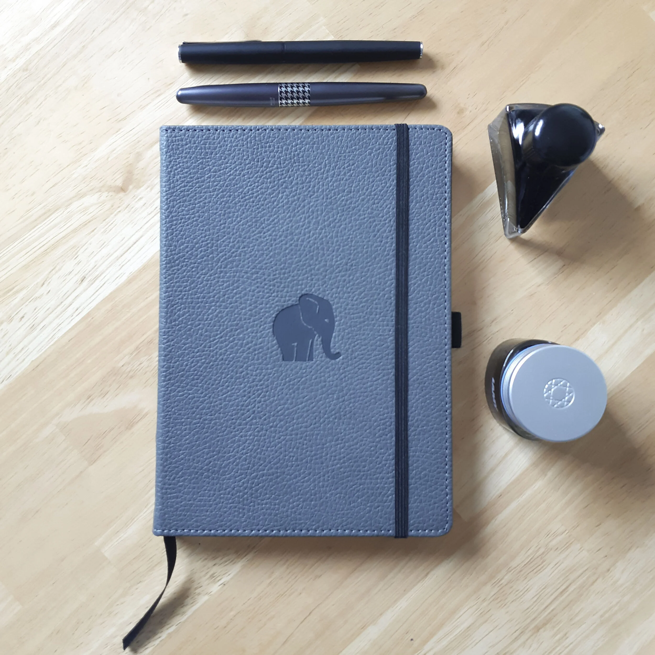 A Wildlife collection notebook, “Naila” the grey elephant, pictured with a Diplomat Esteem in Lapis Black, Pilot Metropolitan in Houndstooth, Diamine Anniversary Silver Fox ink bottle, and a Lamy Crystal Agate ink bottle.