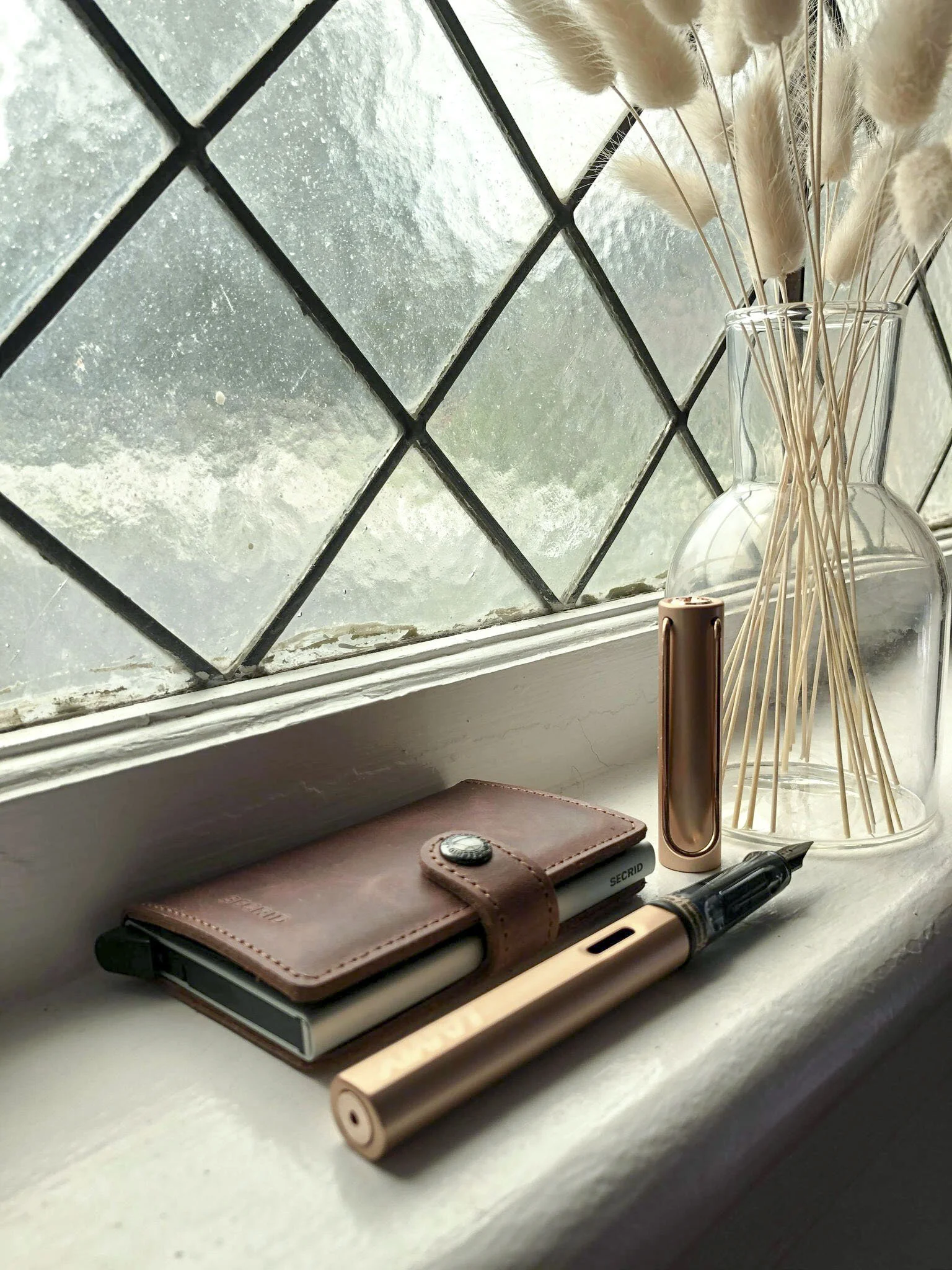The Rose Gold Lamy Lx fountain pen, pictured here with a Secrid Miniwallet, is a classy addition to any pen case.