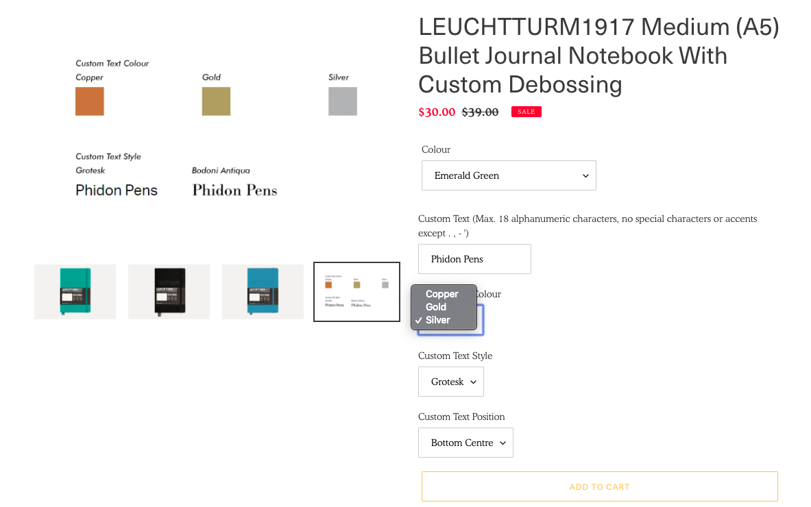 There are three choices for the colour of your debossing: gold, copper, and silver. Choose which one you’d like using the drop-down menu.